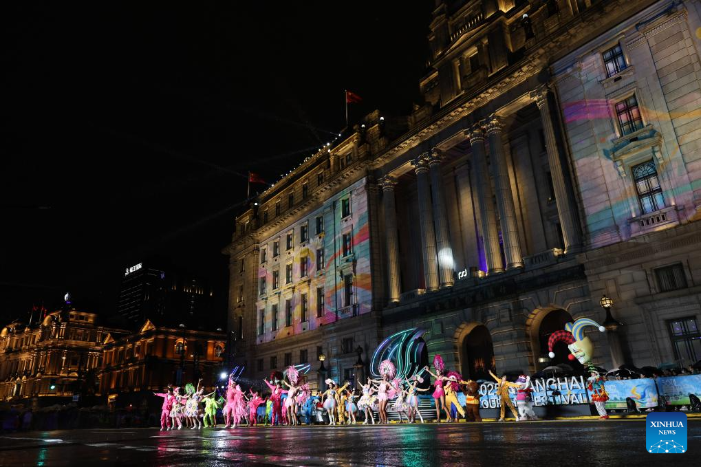 Actors perform in front of buildings at the Bund during the floats parade of the Shanghai Tourism Festival in Shanghai, east China, Sept. 13, 2025.