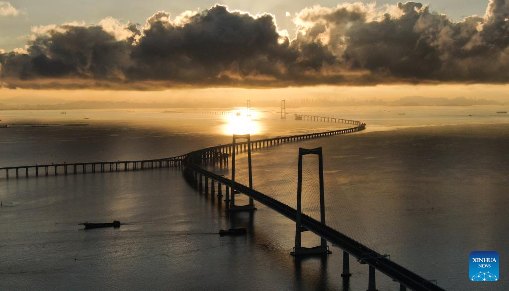 An aerial drone photo taken on Sept. 14, 2025 shows a section of the Shenzhen-Zhongshan link at sunrise in south China's Guangdong Province. (Xinhua/Deng Hua)