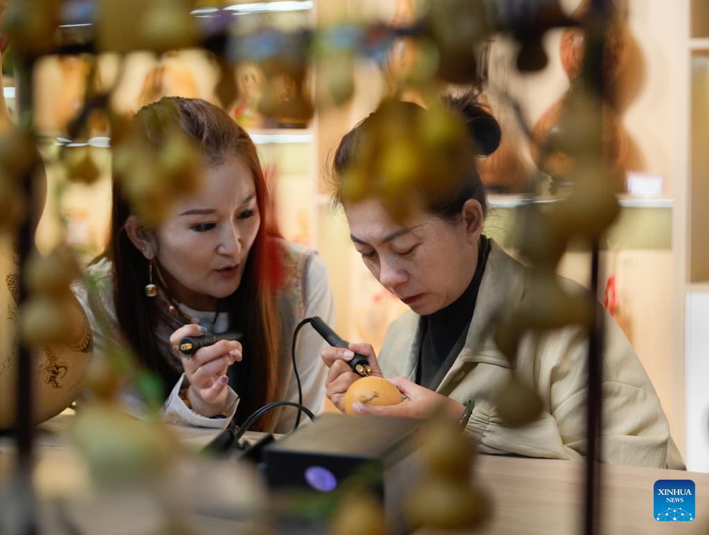 A traditional culture enthusiast (R) learns gourd pyrography following an artisan's guidance at the Emin County memory museum in Emin County, northwest China's Xinjiang Uygur Autonomous Region, Sept. 13, 2025.