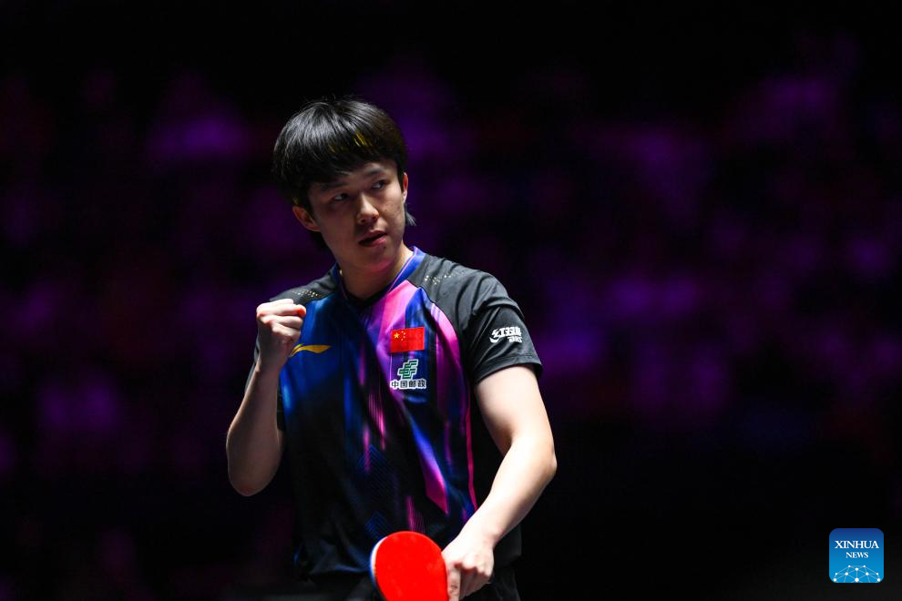 Wang Chuqin of China reacts during the men's singles final match between Wang Chuqin of China and Hugo Calderano of Brazil at the 2025 World Table Tennis (WTT) Champions Macao in Macao, south China, Sept. 14, 2025. (Xinhua/Cheong Kam Ka)
