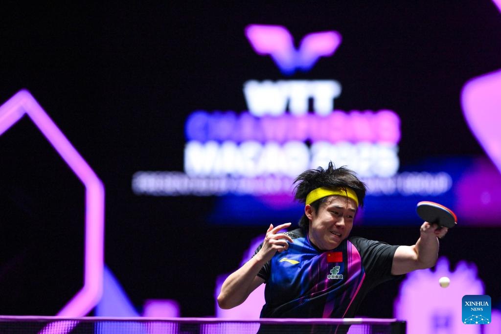 Wang Chuqin of China competes during the men's singles final match between Wang Chuqin of China and Hugo Calderano of Brazil at the 2025 World Table Tennis (WTT) Champions Macao in Macao, south China, Sept. 14, 2025. (Xinhua/Cheong Kam Ka)