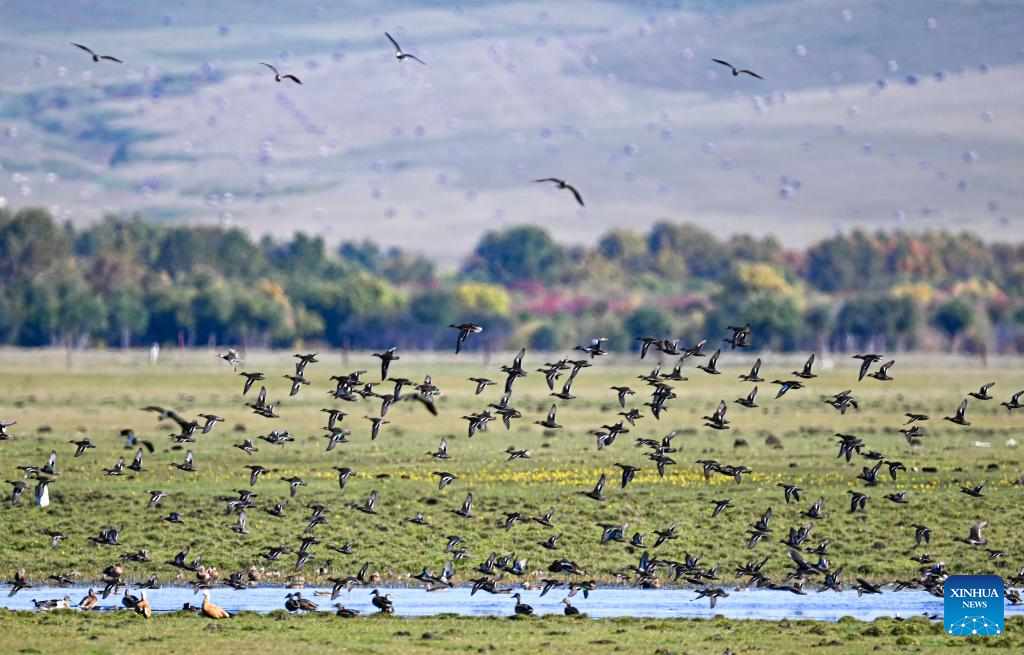 Ruddy shelducks fly over the Ergune Wetland Nature Reserve in Hulun Buir, north China's Inner Mongolia Autonomous Region, Sept. 15, 2025. (Xinhua/Bei He)