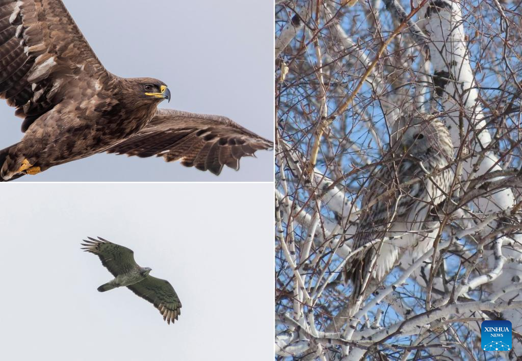 This combo photo shows three rare bird species documented by Bao Jincai, including steppe eagle (L above, taken on Sept. 5, 2025), oriental honey-buzzard (L below, taken on June 8, 2025) and ural owl (R, taken on March 5, 2025) in the Ergune Wetland Nature Reserve in Hulun Buir, north China's Inner Mongolia Autonomous Region. (Xinhua)