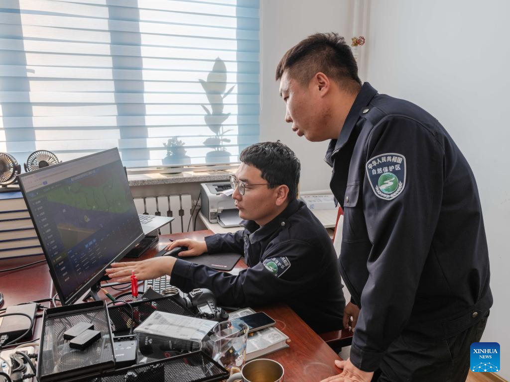 Bao Jincai (L) and his colleague study patrol routes via a 3D digital sandtable at Ergune Wetland Nature Reserve Administration in Hulun Buir, north China's Inner Mongolia Autonomous Region, Sept. 16, 2025. (Xinhua/Ma Jinrui)