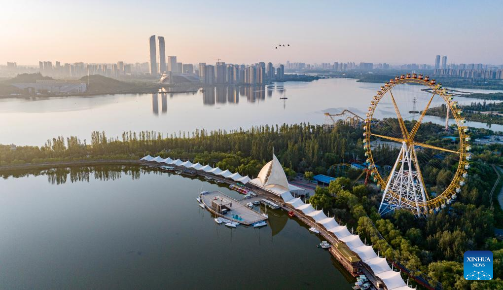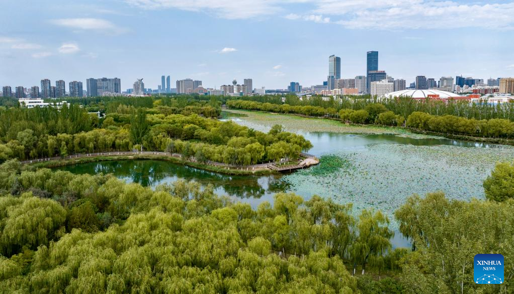 An aerial drone photo taken on Sept. 17, 2025 shows a view of Haibao Park in Yinchuan, northwest China's Ningxia Hui Autonomous Region.