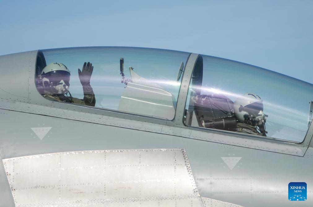 Pilots of a J-16 fighter jet greet the audience during the 2025 aviation open-day activities of the Chinese People's Liberation Army Air Force and Changchun Air Show in Changchun, northeast China's Jilin Province, Sept. 19, 2025. The events kicked off here on Friday. (Xinhua/Yan Linyun)