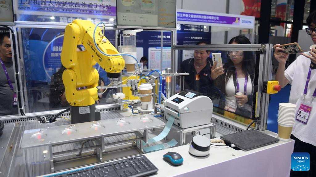 A robot makes drinks at the Nanning International Convention and Exhibition Center in Nanning, capital of south China's Guangxi Zhuang Autonomous Region, Sept. 19, 2025. Products involving cutting-edge technologies such as artificial intelligence, low-altitude economy and humanoid robots are showcased during the ongoing 22nd China-ASEAN Expo.