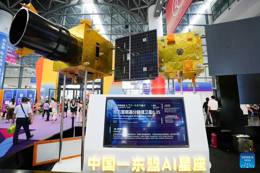 This photo taken on Sept. 19, 2025 shows a satellite model of the China-ASEAN AI Star at the Nanning International Convention and Exhibition Center in Nanning, capital of south China's Guangxi Zhuang Autonomous Region. Products involving cutting-edge technologies such as artificial intelligence, low-altitude economy and humanoid robots are showcased during the ongoing 22nd China-ASEAN Expo.