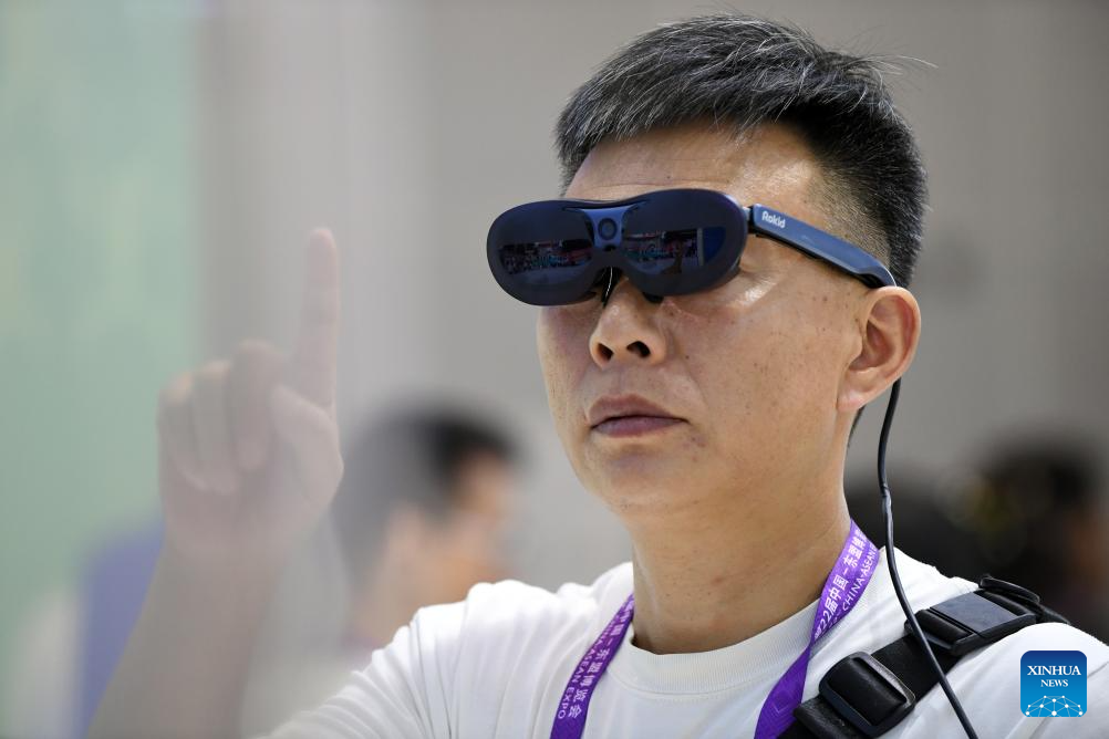 A visitor tries a pair of AR glasses at the Nanning International Convention and Exhibition Center in Nanning, capital of south China's Guangxi Zhuang Autonomous Region, Sept. 19, 2025. Products involving cutting-edge technologies such as artificial intelligence, low-altitude economy and humanoid robots are showcased during the ongoing 22nd China-ASEAN Expo.