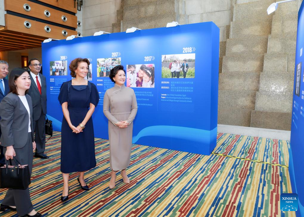 BEIJING, Sept. 19 (Xinhua) -- Peng Liyuan, wife of Chinese President Xi Jinping, and Audrey Azoulay, director-general of the United Nations Educational, Scientific and Cultural Organization (UNESCO), attended the 2025 UNESCO Prize for Girls' and Women's Education award ceremony and the 10th anniversary celebration of the prize in Beijing on Friday.