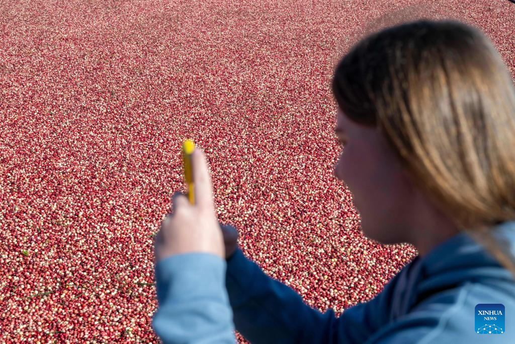 A Russian tourist takes photos at a cranberry planting base in Fuyuan, northeast China's Heilongjiang Province, on Sept. 21, 2025. A cranberry harvest festival was held on Sunday in Fuyuan, a leading hub for large-scale cranberry cultivation in China. (Xinhua/Zhang Tao)