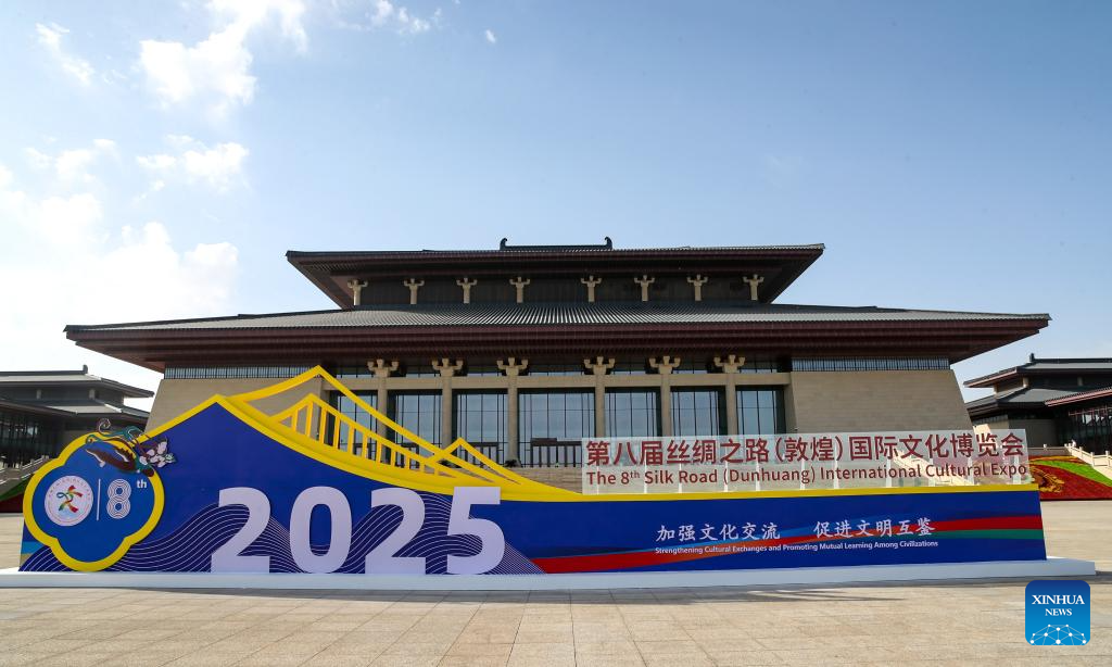 This photo taken on Sept. 21, 2025 shows the slogan of the 8th Silk Road (Dunhuang) International Cultural Expo in Dunhuang, northwest China's Gansu Province. More than 1,200 representatives from 97 countries and eight international organizations have gathered at the 8th Silk Road (Dunhuang) International Cultural Expo, which kicked off on Sunday in Dunhuang, a key hub on the ancient Silk Road in northwest China. (Xinhua/Lang Bingbing)