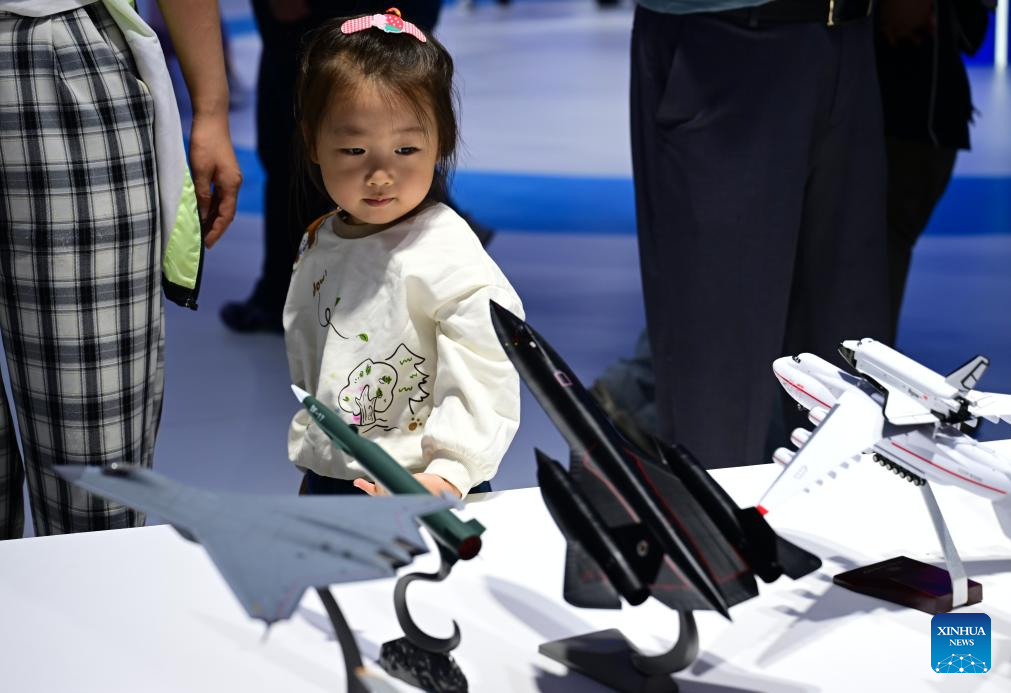 A child views plane models displayed at the 2025 World Manufacturing Convention (WMC) in Hefei, east China's Anhui Province, Sept. 20, 2025. Themed "Intelligent Manufacturing For a Better Future", the 2025 WMC kicked off here on Saturday. (Xinhua/Zhou Mu)