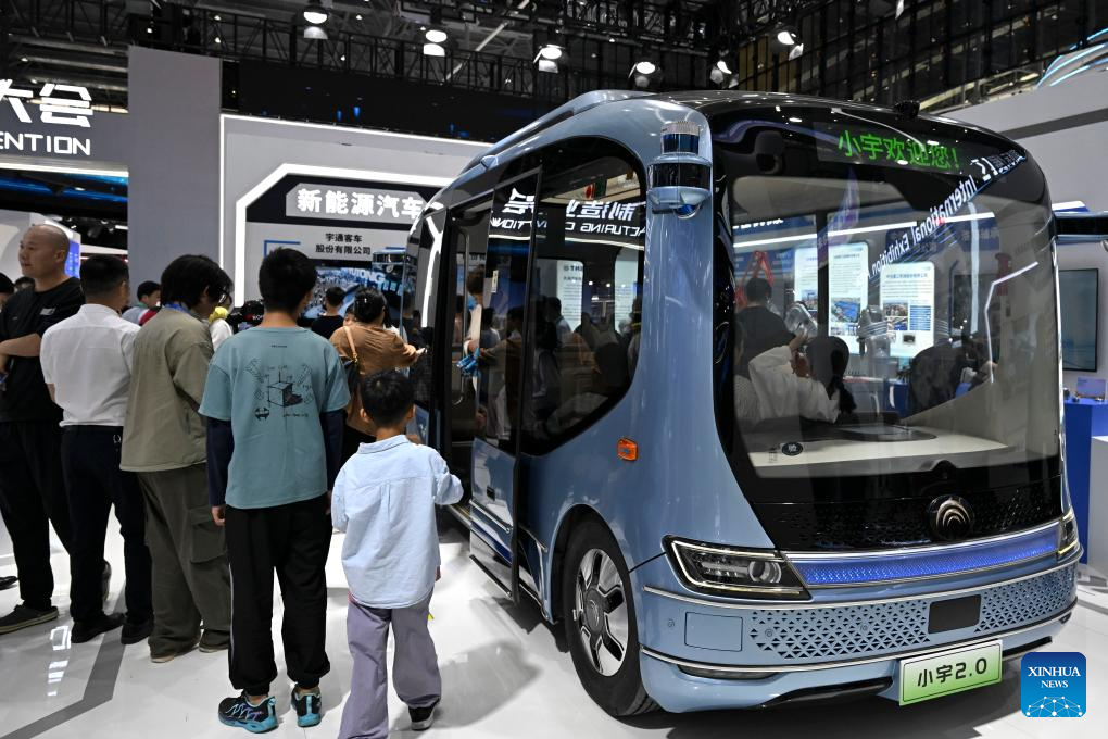 People view an autonomous bus displayed at the 2025 World Manufacturing Convention (WMC) in Hefei, east China's Anhui Province, Sept. 20, 2025. Themed "Intelligent Manufacturing For a Better Future", the 2025 WMC kicked off here on Saturday. (Xinhua/Huang Bohan)