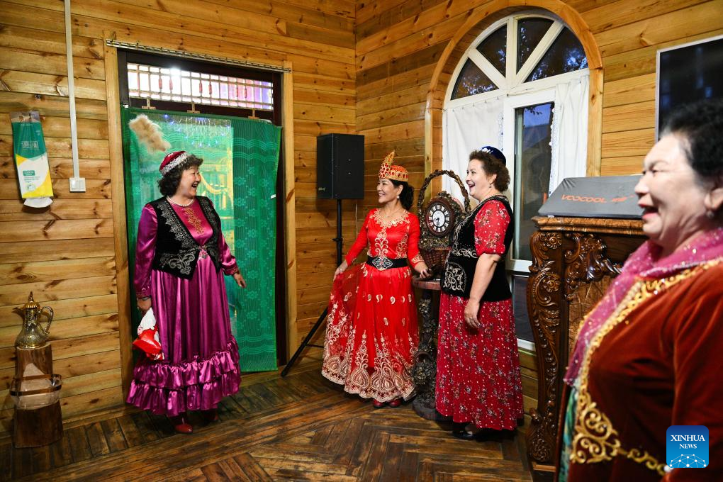 Guests from various ethnic groups are seen at the agritainment of Ma Xiuhua in Tacheng City, northwest China's Xinjiang Uygur Autonomous Region, Sept. 17, 2025.(Xinhua/Xin Yuewei)