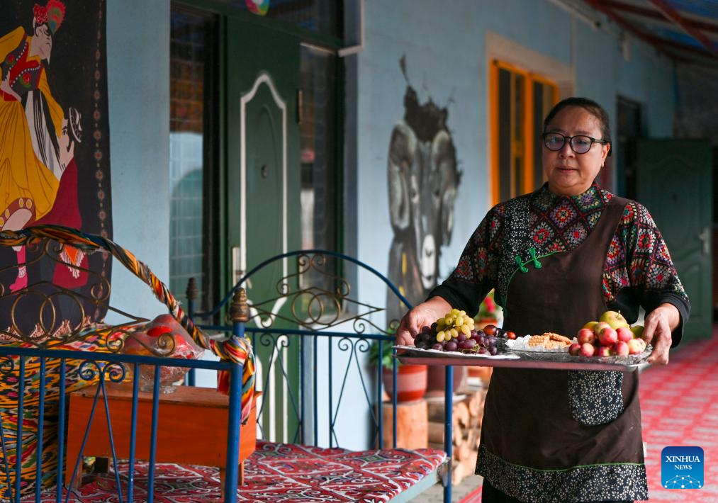Ma Xiuhua serves fruits at her agritainment in Tacheng City, northwest China's Xinjiang Uygur Autonomous Region, Sept. 17, 2025. Ma Xiuhua, 60, is a native of Tacheng. Together with her husband, she built an agritainment named "Friends Manor" in their hometown, where they welcome guests from all over the country. (Xinhua/Chen Shuo)