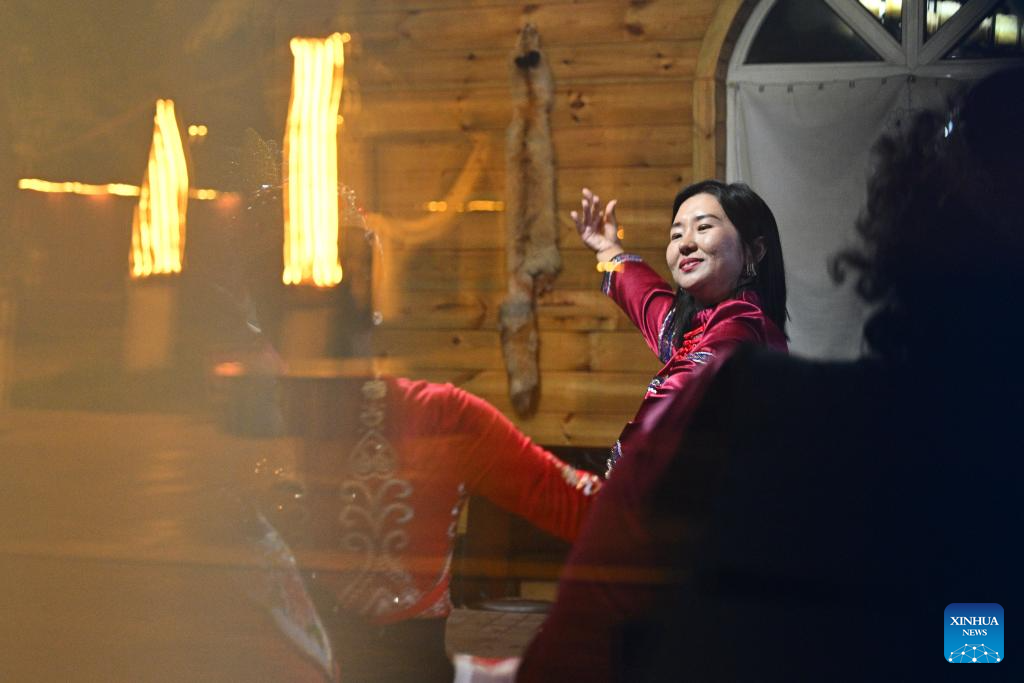 A guest from Daur ethnic group dances after a meal at the agritainment of Ma Xiuhua in Tacheng City, northwest China's Xinjiang Uygur Autonomous Region, Sept. 17, 2025.(Xinhua/Xin Yuewei)