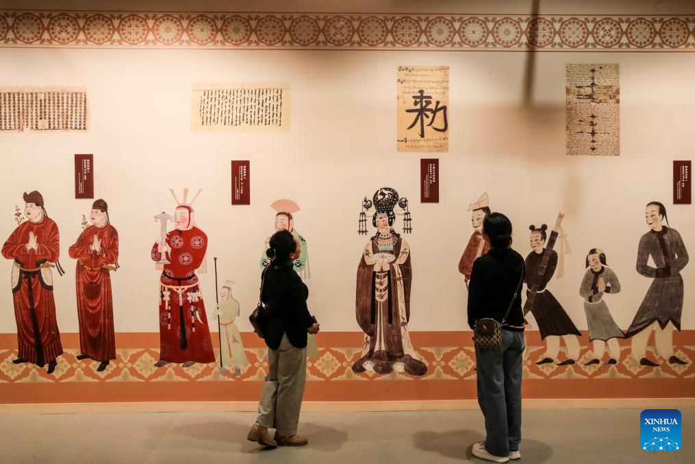People visit an exhibition held by the Dunhuang Academy during the 8th Silk Road (Dunhuang) International Cultural Expo in Dunhuang, northwest China's Gansu Province, Sept. 22, 2025. More than 1,200 representatives from 97 countries and eight international organizations have gathered at the 8th Silk Road (Dunhuang) International Cultural Expo, which kicked off on Sunday in Dunhuang, a key hub on the ancient Silk Road in northwest China. (Xinhua/Lang Bingbing)