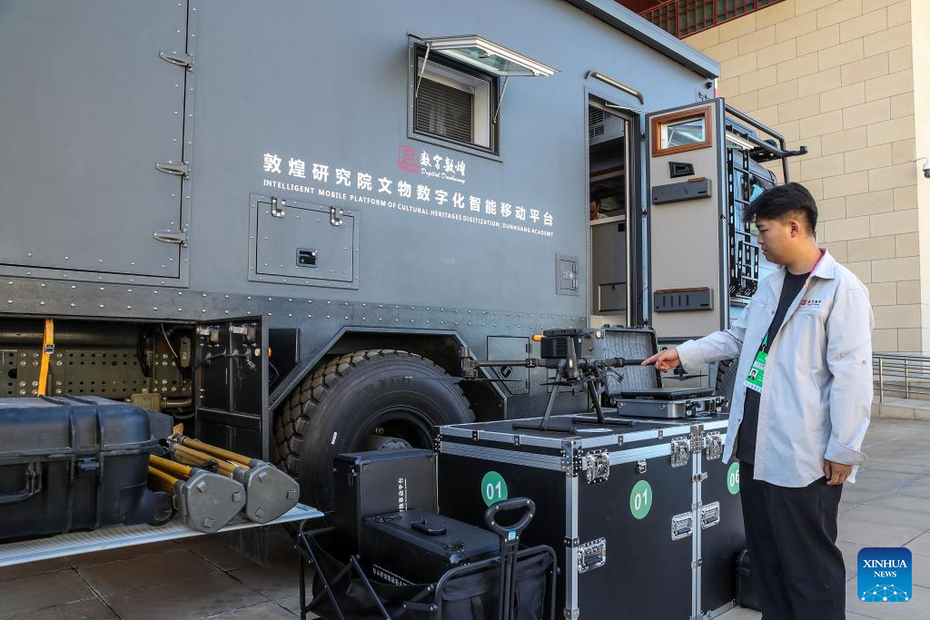 A staff member displays an intelligent mobile platform of cultural heritage digitization at an exhibition held by the Dunhuang Academy during the 8th Silk Road (Dunhuang) International Cultural Expo in Dunhuang, northwest China's Gansu Province, Sept. 22, 2025. More than 1,200 representatives from 97 countries and eight international organizations have gathered at the 8th Silk Road (Dunhuang) International Cultural Expo, which kicked off on Sunday in Dunhuang, a key hub on the ancient Silk Road in northwest China. (Xinhua/Lang Bingbing)