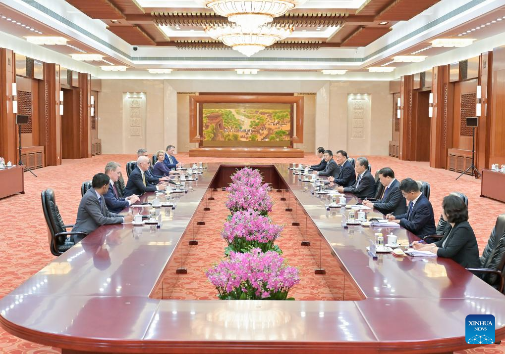 Zhao Leji, chairman of the National People's Congress (NPC) Standing Committee, meets with a U.S. congressional delegation led by Representative Adam Smith in Beijing, capital of China, Sept. 23, 2025. (Xinhua/Gao Jie)
