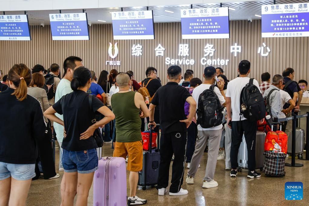 Passengers line up to apply for ticket changes and refunds at the service center of Guangzhou South Railway Station in Guangzhou, south China's Guangdong Province, Sept. 23, 2025. South China's Guangdong Province raised its wind emergency response to the highest level at 10 a.m. Tuesday, as Typhoon Ragasa is forecast to make landfall along the central or western coastal areas of the province as a strong or super strong typhoon within 24 hours. (Xinhua/Liu Dawei)