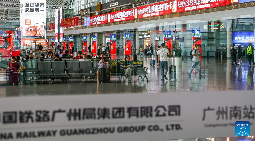 Passengers enter Guangzhou South Railway Station to board train in Guangzhou, south China's Guangdong Province, Sept. 23, 2025. South China's Guangdong Province raised its wind emergency response to the highest level at 10 a.m. Tuesday, as Typhoon Ragasa is forecast to make landfall along the central or western coastal areas of the province as a strong or super strong typhoon within 24 hours. (Xinhua/Liu Dawei)