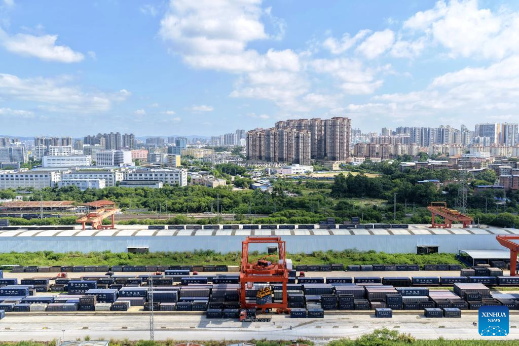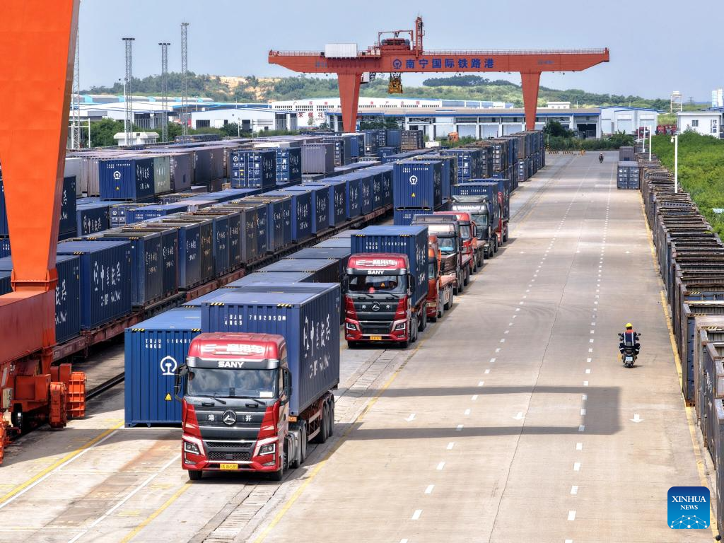 An aerial drone photo taken on Sept. 23, 2025 shows the Nanning International Railway Port in Nanning, south China's Guangxi Zhuang Autonomous Region. As of Sept. 22, freight trains departing from Guangxi heading to Vietnam have transported a total of 26,000 TEUs (twenty-foot equivalent units) of export goods, marking a year-on-year surge of 173 percent, according to the China Railway Nanning Group Co., Ltd. (Xinhua/Xing Guangli)