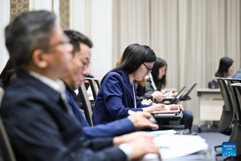 Journalists work at a press conference held by the State Council Information Office (SCIO) on China's achievements in emergency management reform and development during the 14th Five-Year Plan period (2021-2025) in Beijing, capital of China, Sept. 24, 2025.