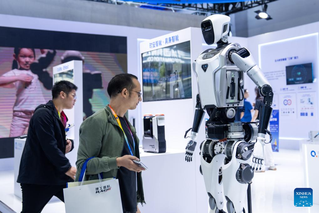 A visitor looks at a humanoid robot displayed at the 4th International Summit on BDS Applications in Zhuzhou, central China's Hunan Province, Sept. 24, 2025. The 4th International Summit on BDS Applications kicked off here on Wednesday. (Xinhua/Chen Sihan)