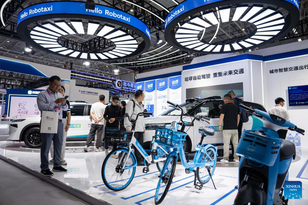 Visitors view shared bicycles equipped with BeiDou Navigation Satellite System (BDS) during the 4th International Summit on BDS Applications in Zhuzhou, central China's Hunan Province, Sept. 24, 2025. The 4th International Summit on BDS Applications kicked off here on Wednesday. (Xinhua/Chen Sihan)