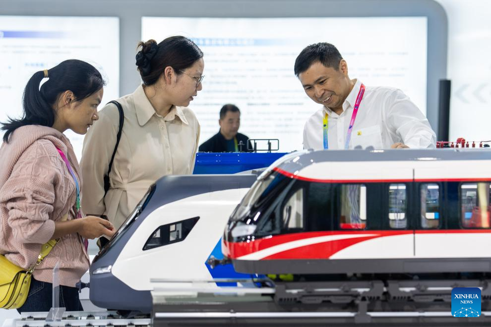 A staff member (1st R) introduces domestic EMU trains during the 4th International Summit on BeiDou Navigation Satellite System (BDS) Applications in Zhuzhou, central China's Hunan Province, Sept. 24, 2025. The 4th International Summit on BDS Applications kicked off here on Wednesday. (Xinhua/Chen Sihan)