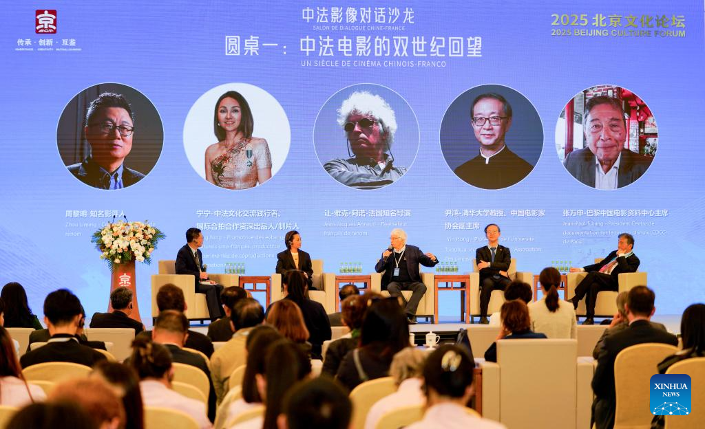 French director Jean-Jacques Annaud (C) speaks during the "Sino-French Audiovisual Dialogue Salon" of the "Wind in Motion: Sino-French Audiovisual Dialogue" series events held as part of the Beijing Culture Forum in Beijing, capital of China, Sept. 24, 2025. (Xinhua/Xiao Xiao)