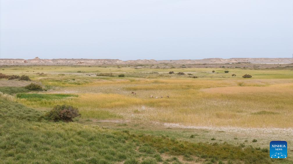 Przewalski's horses are pictured in the Dunhuang West Lake National Nature Reserve in Dunhuang, northwest China's Gansu Province, on Sept. 24, 2025. The Dunhuang West Lake National Nature Reserve in Gansu Province covers an area of approximately 660,000 hectares, featuring a diverse ecosystem including wetlands, grasslands, forests and Gobi deserts, which makes it an experimental zone for the wild release of the Przewalski's horses. (Xinhua/Lang Bingbing)