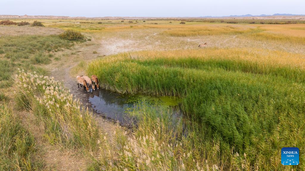An aerial drone photo taken on Sept. 24, 2025 shows Przewalski's horses drinking water in the Dunhuang West Lake National Nature Reserve, in Dunhuang, northwest China's Gansu Province. The Dunhuang West Lake National Nature Reserve in Gansu Province covers an area of approximately 660,000 hectares, featuring a diverse ecosystem including wetlands, grasslands, forests and Gobi deserts, which makes it an experimental zone for the wild release of the Przewalski's horses. (Xinhua/Lang Bingbing)