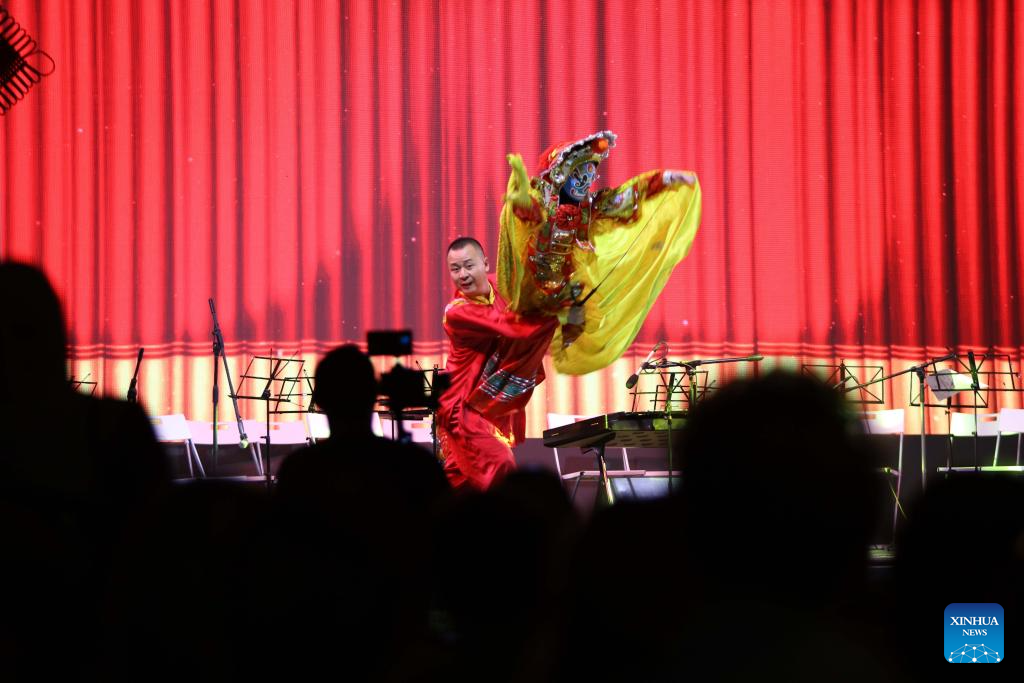 An artist performs rod puppet show during the 2025 "A Moment to Remember -- Mid-Autumn Chinese Folk Concert" staged in Amman, Jordan, on Sept. 24, 2025. The concert was staged here on Wednesday evening, offering Jordanian audiences a vibrant showcase of Chinese folk music. More than 300 delegates from both countries attended the concert. (Photo by Mohammad Abu Ghosh/Xinhua)
