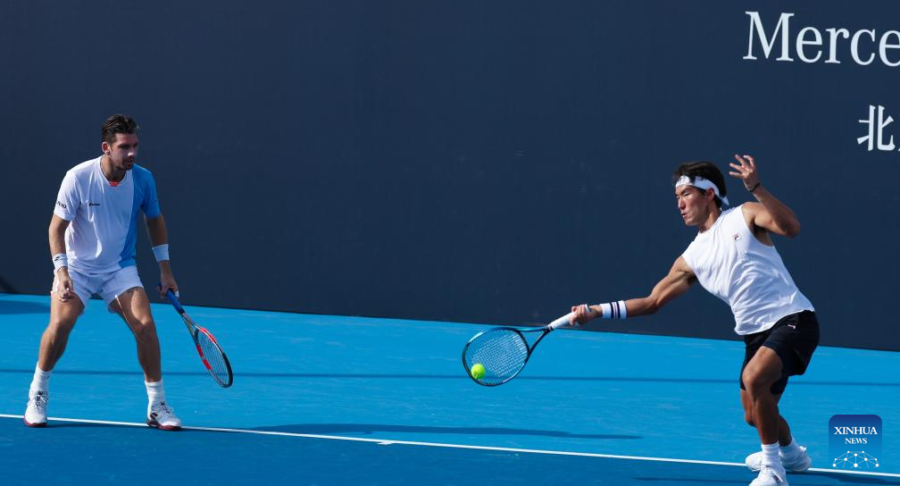 Bu Yunchaokete (L)/Cameron Norrie (front) compete during the men's doubles first round match between Bu Yunchaokete (China)/Cameron Norrie (Britain) and Marcelo Melo (Brazil)/Alexander Zverev (Germany) at 2025 China Open tennis tournament in Beijing, China, Sept. 25, 2025. (Photo by Ma Zihan/Xinhua)