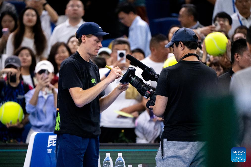 Jannik Sinner (front L) signs autograph on a camera during the men's singles first round match between Jannik Sinner of Italy and Marin Cilic of Croatia at 2025 China Open tennis tournament in Beijing, China, Sept. 25, 2025. (Xinhua/Hu Jingwen)
