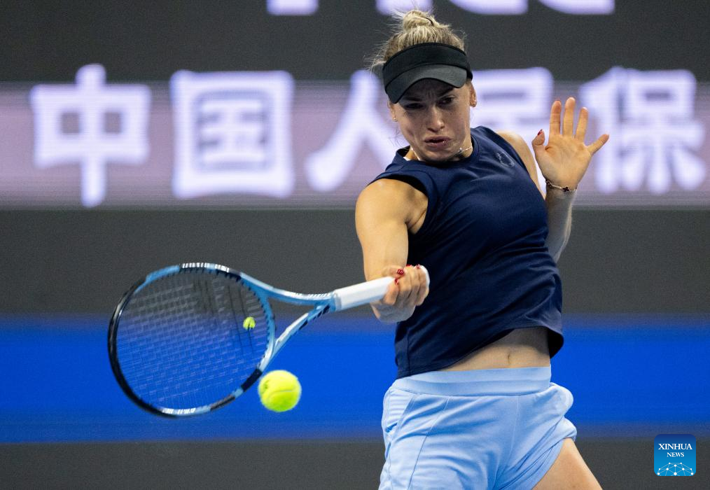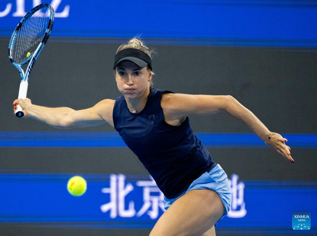 Yulia Putintseva hits a return during the women's singles first round match between Yuan Yue of China and Yulia Putintseva of Kazakhstan at 2025 China Open tennis tournament in Beijing, China, Sept. 25, 2025. (Xinhua/Hu Jingwen)