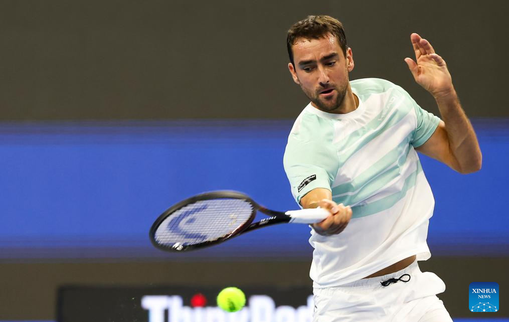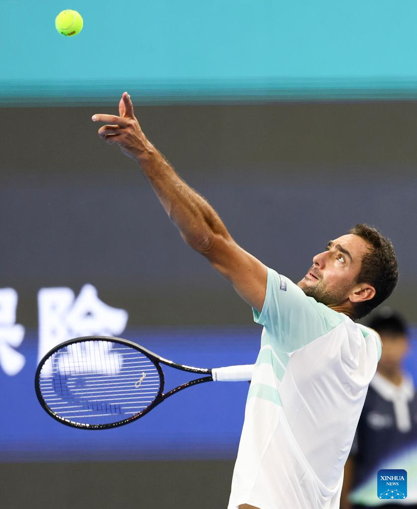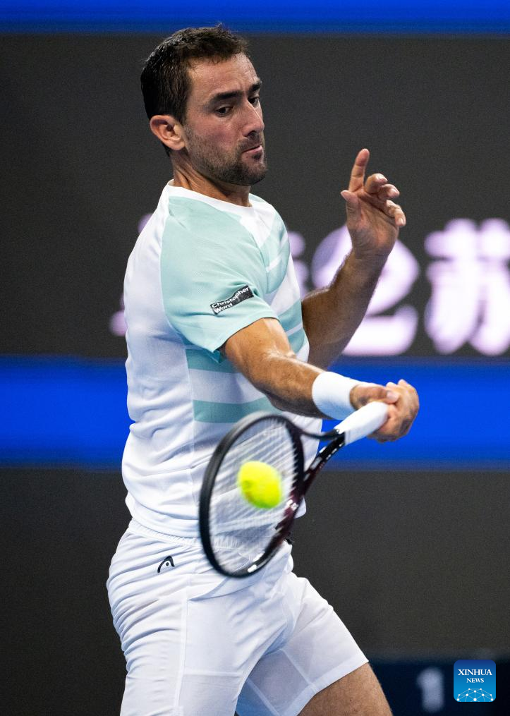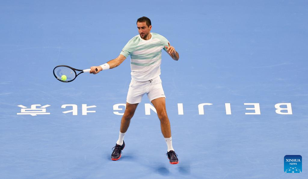 Marin Cilic hits a return during the men's singles first round match between Jannik Sinner of Italy and Marin Cilic of Croatia at 2025 China Open tennis tournament in Beijing, China, Sept. 25, 2025. (Xinhua/Hu Jingwen)
