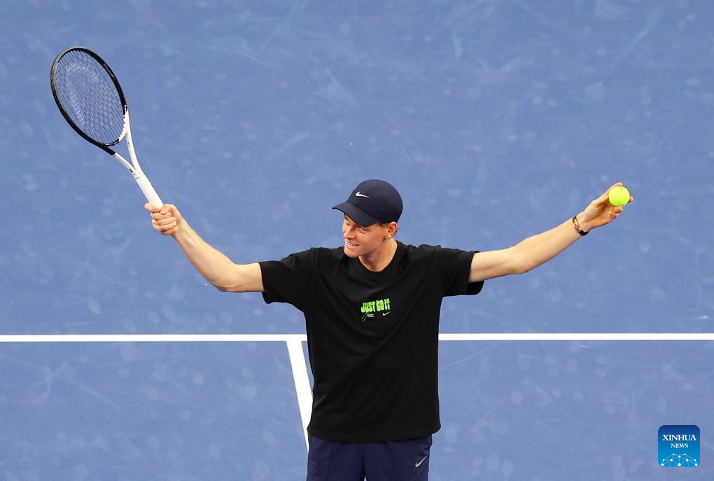 Jannik Sinner greets spectators after the men's singles first round match between Jannik Sinner of Italy and Marin Cilic of Croatia at 2025 China Open tennis tournament in Beijing, China, Sept. 25, 2025. (Xinhua/Du Xinyi)