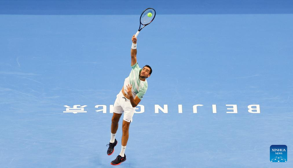 Marin Cilic serves during the men's singles first round match between Jannik Sinner of Italy and Marin Cilic of Croatia at 2025 China Open tennis tournament in Beijing, China, Sept. 25, 2025. (Xinhua/Du Xinyi)