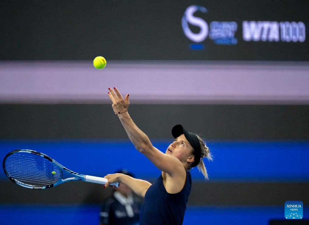 Yulia Putintseva serves during the women's singles first round match between Yuan Yue of China and Yulia Putintseva of Kazakhstan at 2025 China Open tennis tournament in Beijing, China, Sept. 25, 2025. (Xinhua/Hu Jingwen)