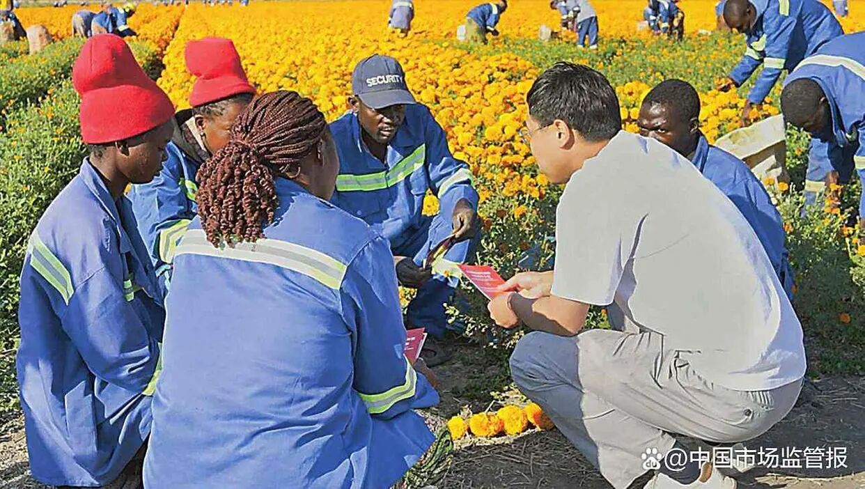 In the China-Zambia Agriculture Standardization Cooperation Demonstration Zone, Chinese experts train local staff on marigold bud maturity and harvesting standards. (Photo from China Market Regulation News)