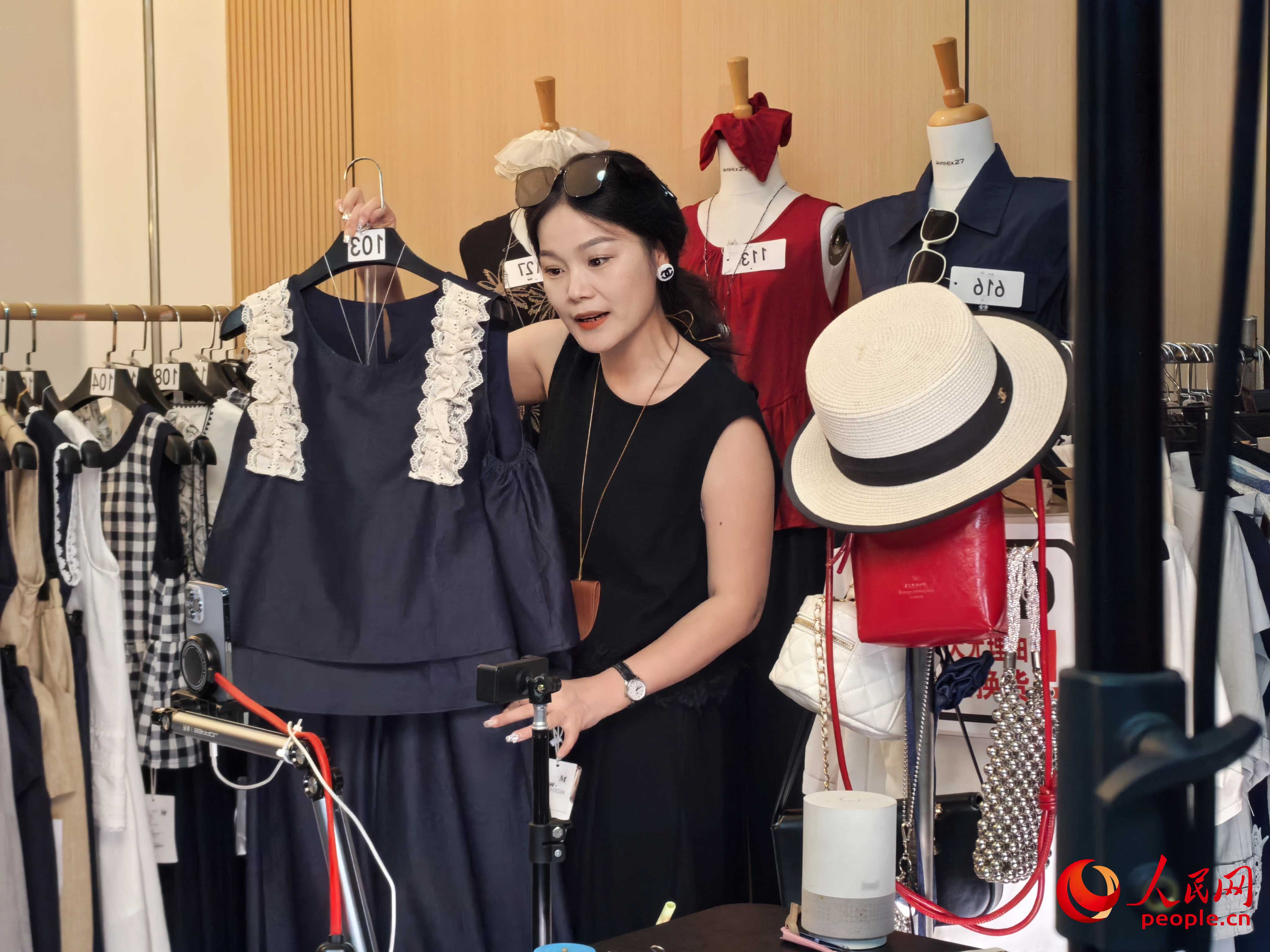 Hostess Yingzi sells clothing via livestreaming at Tianmen Qianguang Media's studios on June 29, 2025. (People's Daily Online/Zhong Wenxing)