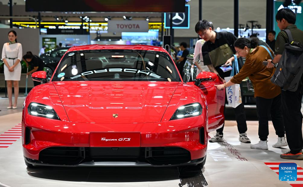 Visitors view a new energy vehicle of Porsche during the 2025 World New Energy Vehicle Congress (WNEVC 2025) in Haikou, south China's Hainan Province, Sept. 27, 2025. The 3-day congress kicked off here on Saturday, featuring series of activities such as conferences and seminars, technology exhibitions, and technology evaluations. (Xinhua/Guo Cheng)