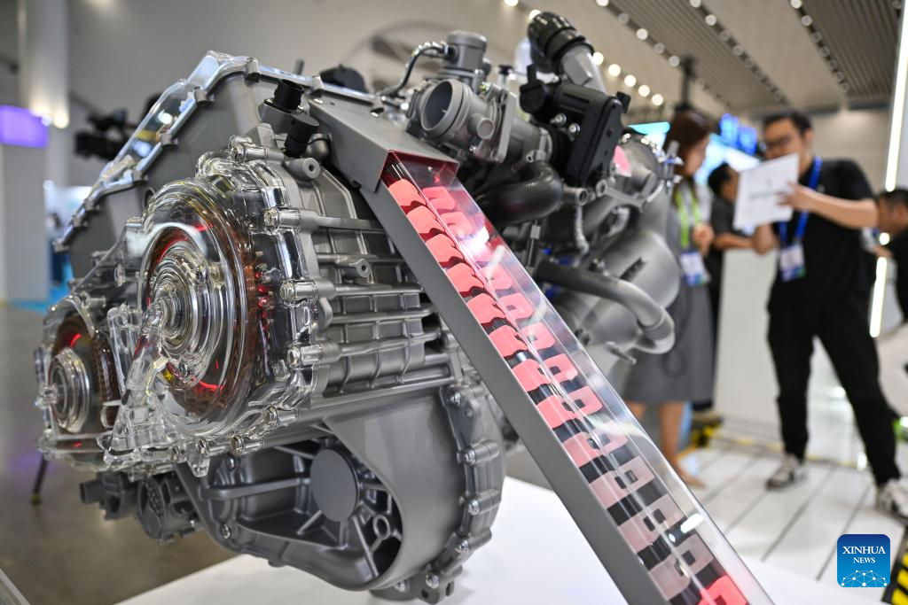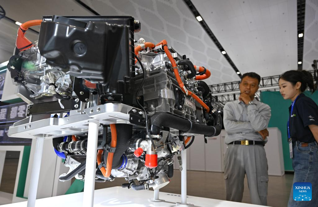 A hybrid power system is on display during the 2025 World New Energy Vehicle Congress (WNEVC 2025) in Haikou, south China's Hainan Province, Sept. 27, 2025. The 3-day congress kicked off here on Saturday, featuring series of activities such as conferences and seminars, technology exhibitions, and technology evaluations. (Xinhua/Guo Cheng)