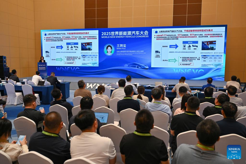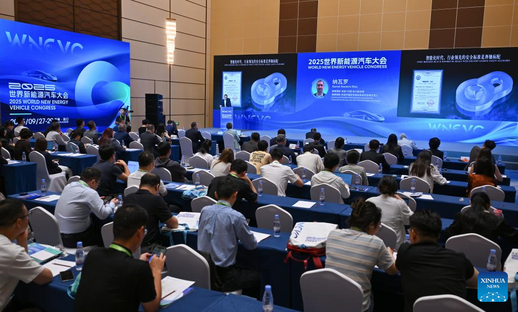 People attend a seminar during the 2025 World New Energy Vehicle Congress (WNEVC 2025) in Haikou, south China's Hainan Province, Sept. 27, 2025. The 3-day congress kicked off here on Saturday, featuring series of activities such as conferences and seminars, technology exhibitions, and technology evaluations. (Xinhua/Guo Cheng)