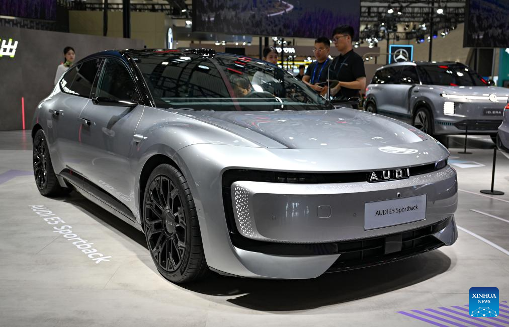 Visitors view a new energy vehicle of Audi during the 2025 World New Energy Vehicle Congress (WNEVC 2025) in Haikou, south China's Hainan Province, Sept. 27, 2025. The 3-day congress kicked off here on Saturday, featuring series of activities such as conferences and seminars, technology exhibitions, and technology evaluations. (Xinhua/Guo Cheng)