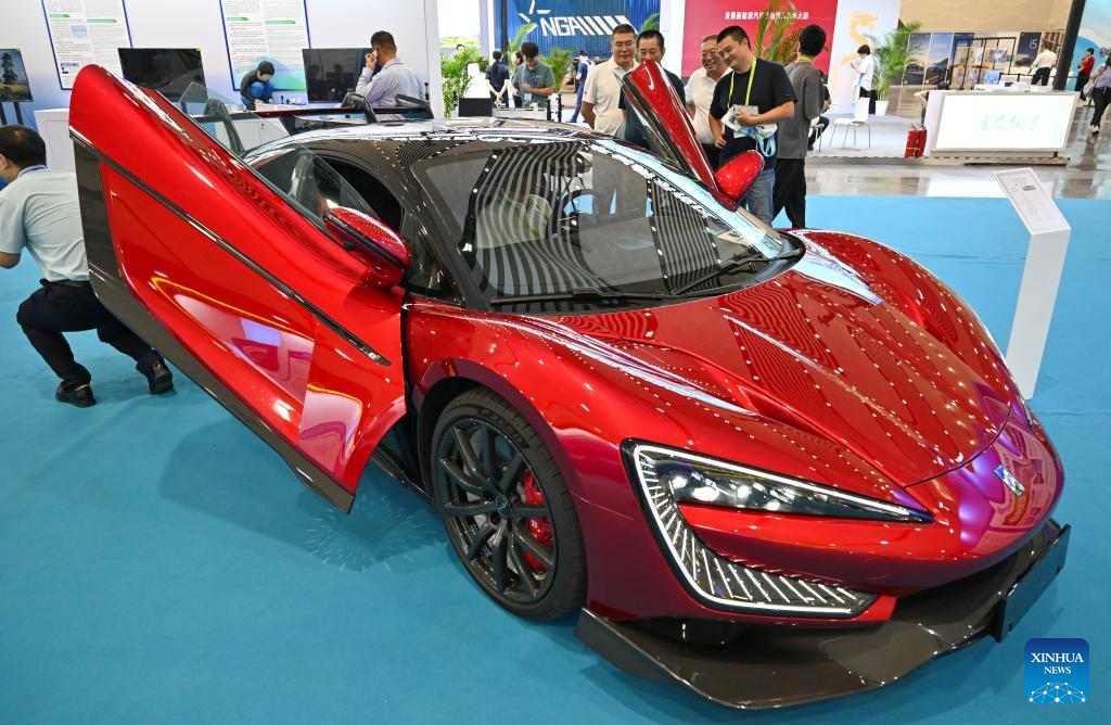 Visitors view a new energy race car during the 2025 World New Energy Vehicle Congress (WNEVC 2025) in Haikou, south China's Hainan Province, Sept. 27, 2025. The 3-day congress kicked off here on Saturday, featuring series of activities such as conferences and seminars, technology exhibitions, and technology evaluations. (Xinhua/Guo Cheng)