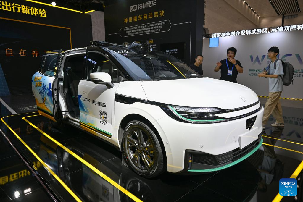 Visitors view an autonomous-driving car for rental service during the 2025 World New Energy Vehicle Congress (WNEVC 2025) in Haikou, south China's Hainan Province, Sept. 27, 2025. The 3-day congress kicked off here on Saturday, featuring series of activities such as conferences and seminars, technology exhibitions, and technology evaluations. (Xinhua/Guo Cheng)